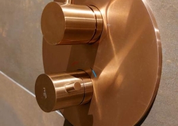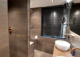 De badkamer is voorzien van een inloopdouche met regendouche in de kleur geborsteld koper.